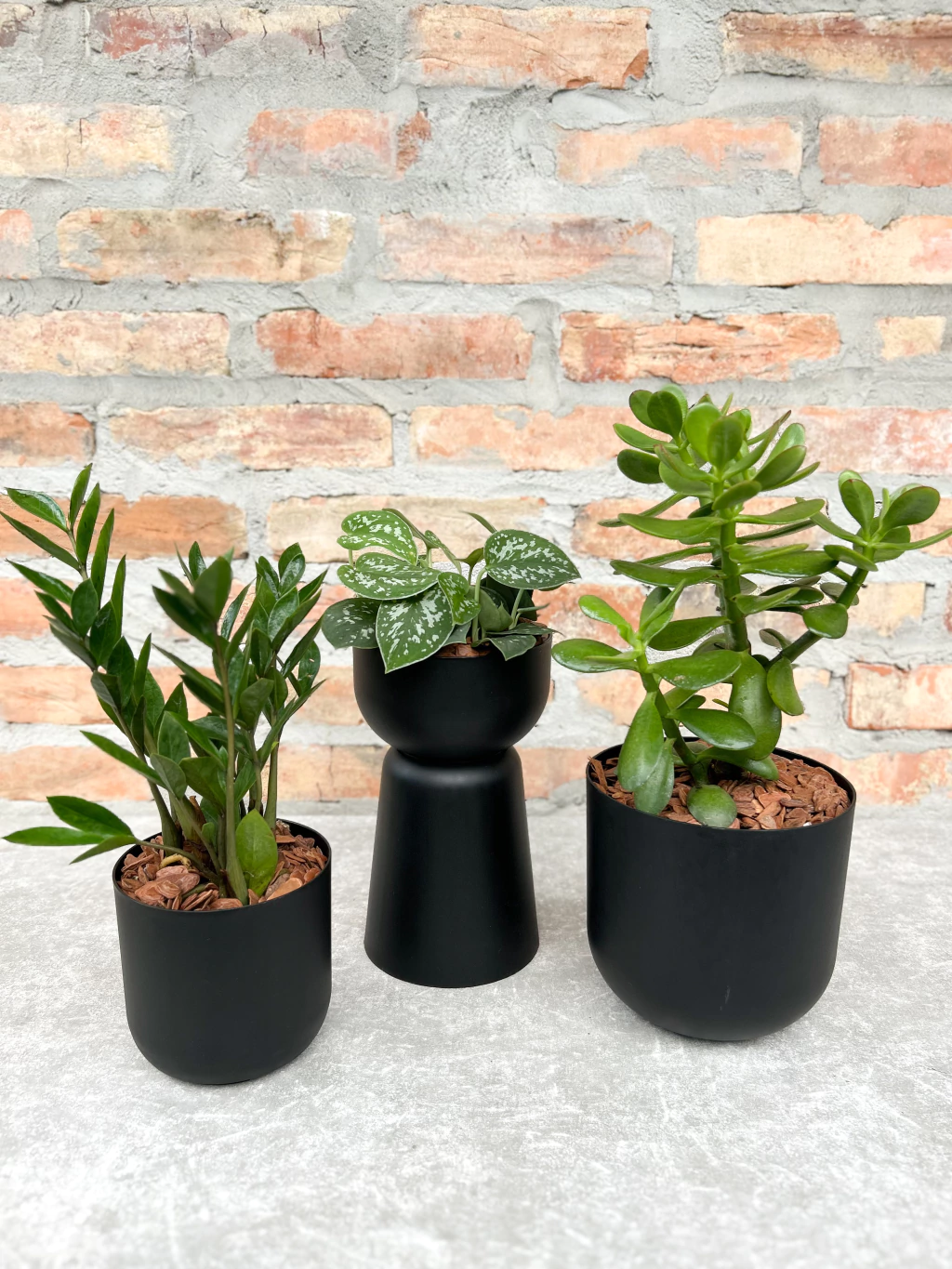 Aqui, ela aparece em um conjunto exclusivo de dois cachepôs sobrepostos, em preto fosco — um toque de design que transforma a planta em peça decorativa.