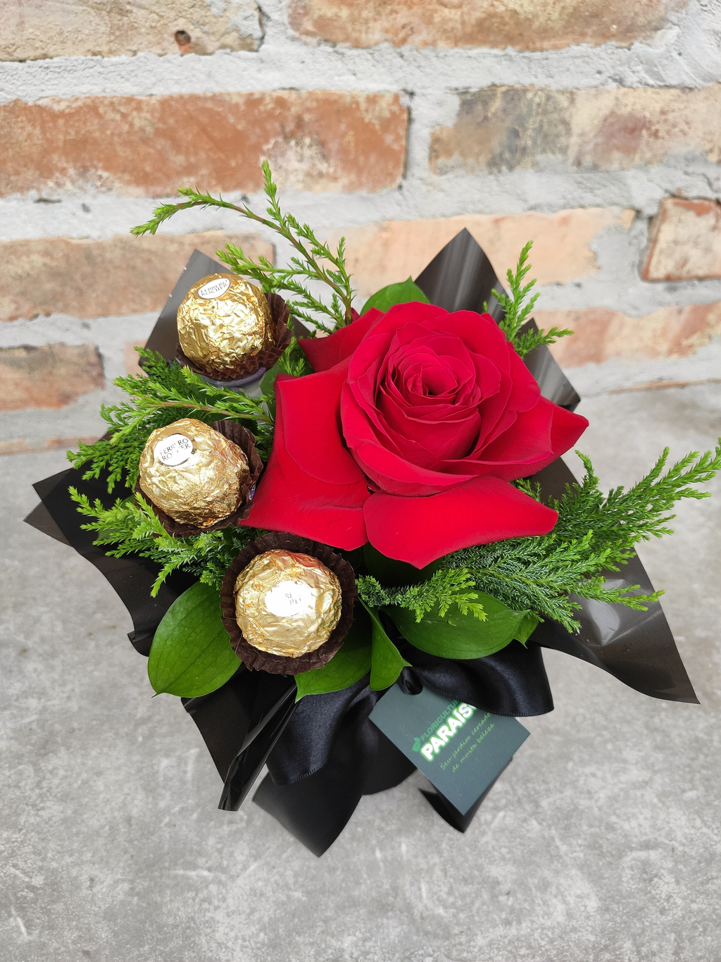 Para você que deseja presentear com um mimo lindo e ainda por cima delicioso, a Floricultura Paraíso criou este arranjo com uma rosa vermelha colombiana e três bombons de chocolate Ferrero Rocher.
